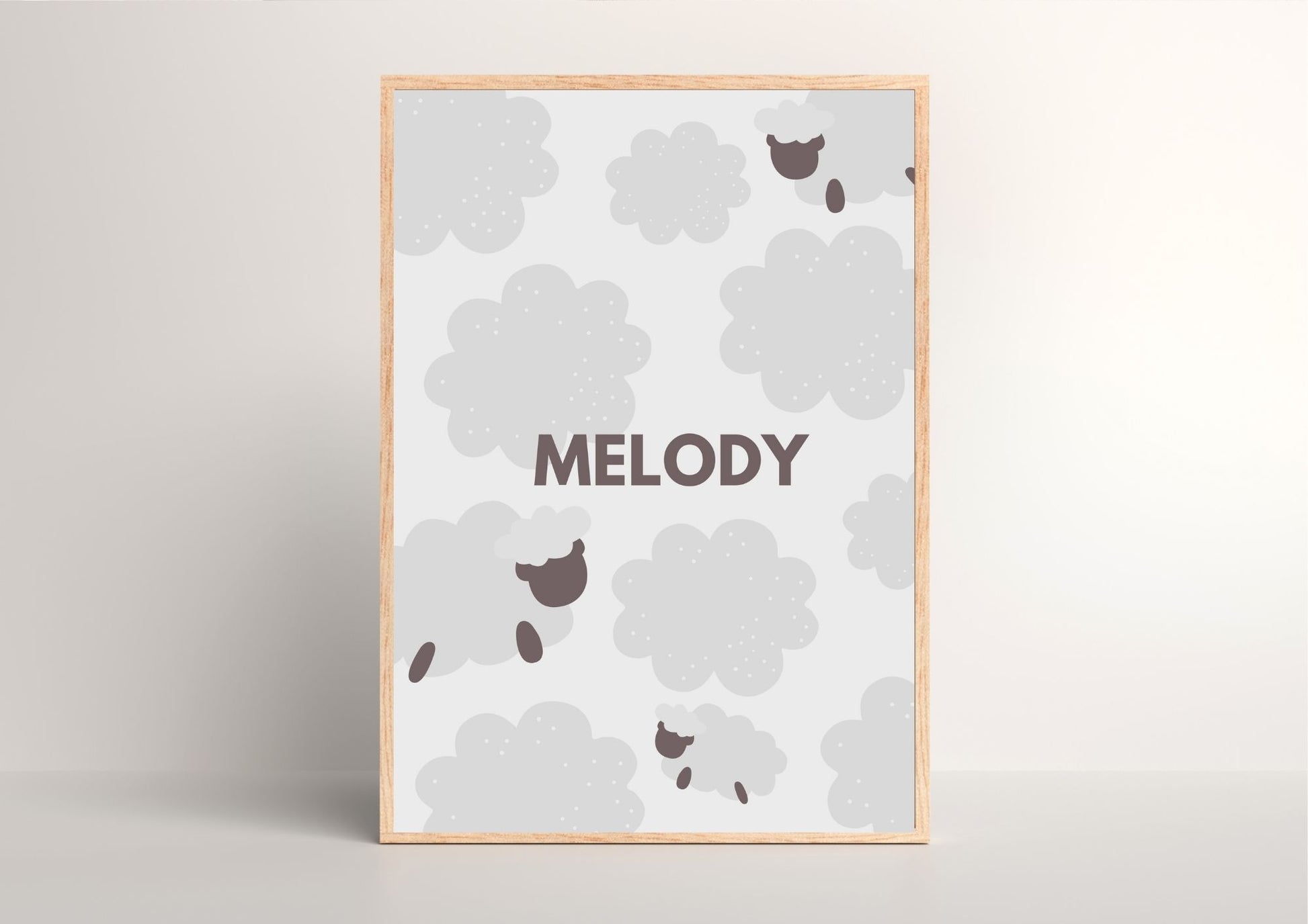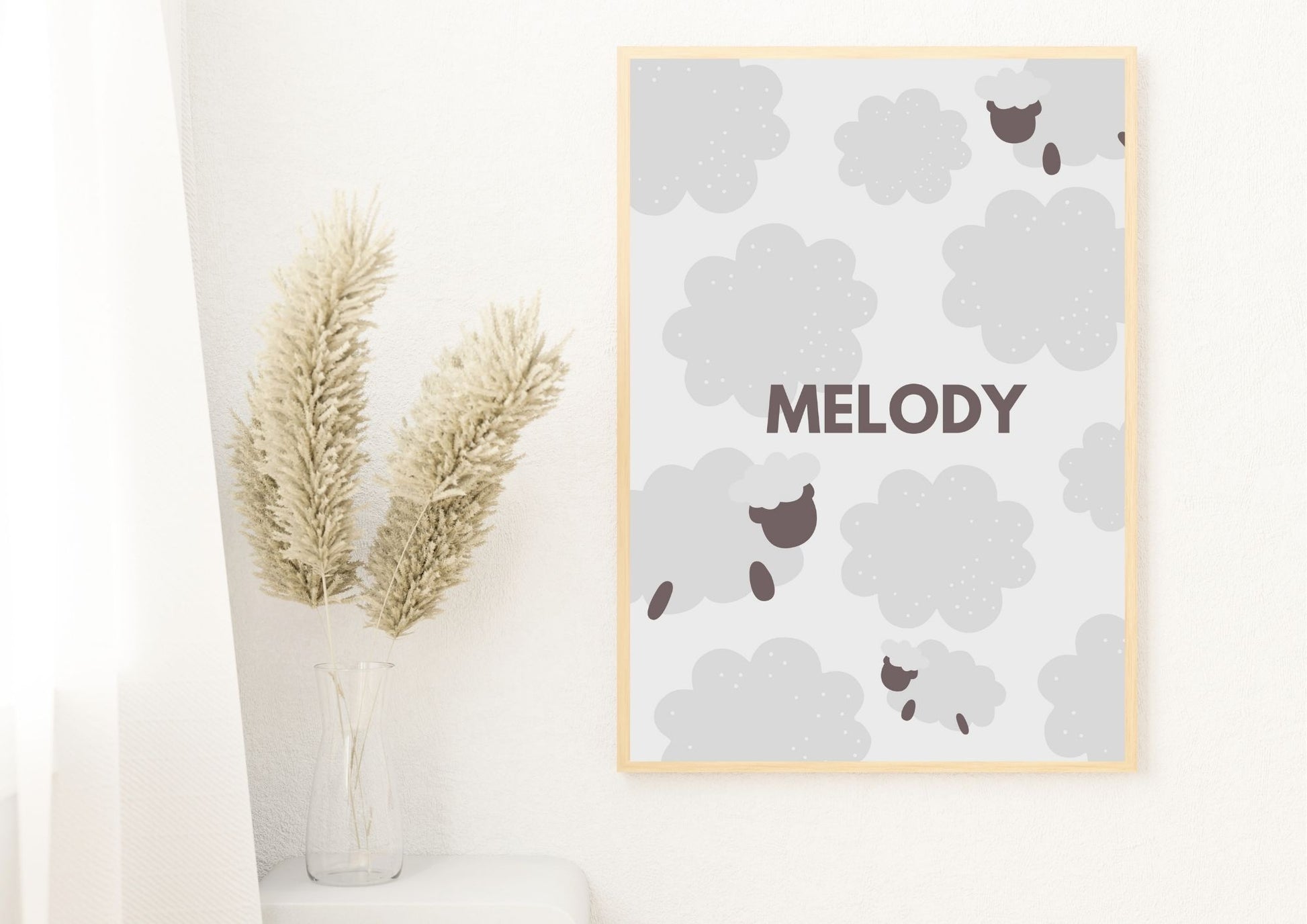 Embrace the charm of the countryside with the "Wooly Wonders" poster! This delightful design features a playful scene of fluffy white sheep frolicking amidst soft clouds. Your baby's name is displayed playfully in a charming font, adding a touch of personalization to this whimsical scene.